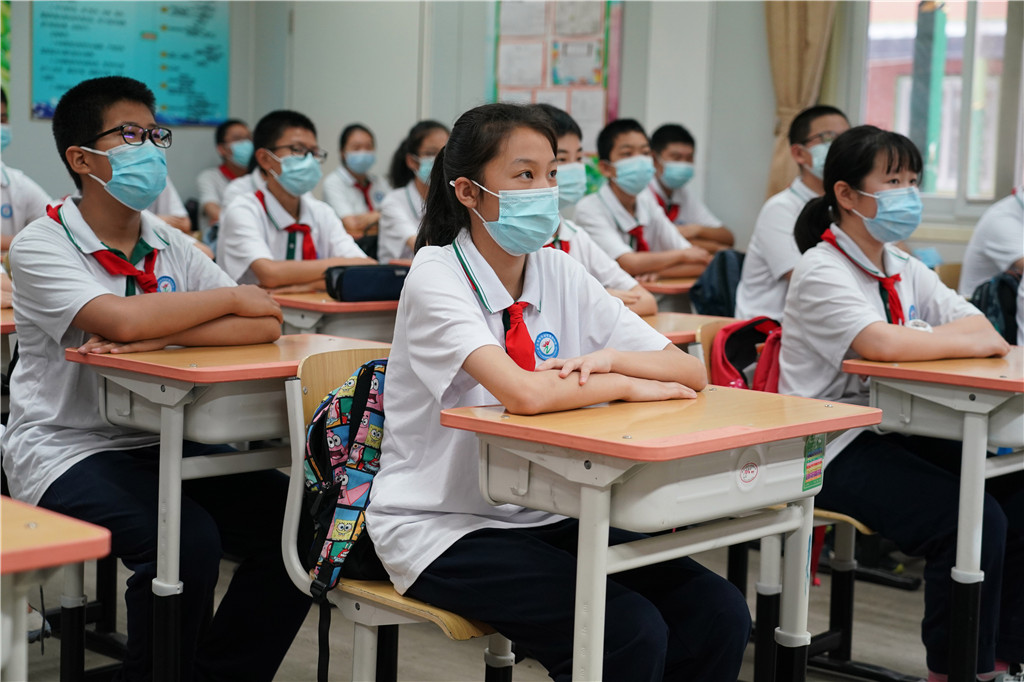 6月27日,在北京市平谷区第五中学,初一(6)班学生上返校第一课。