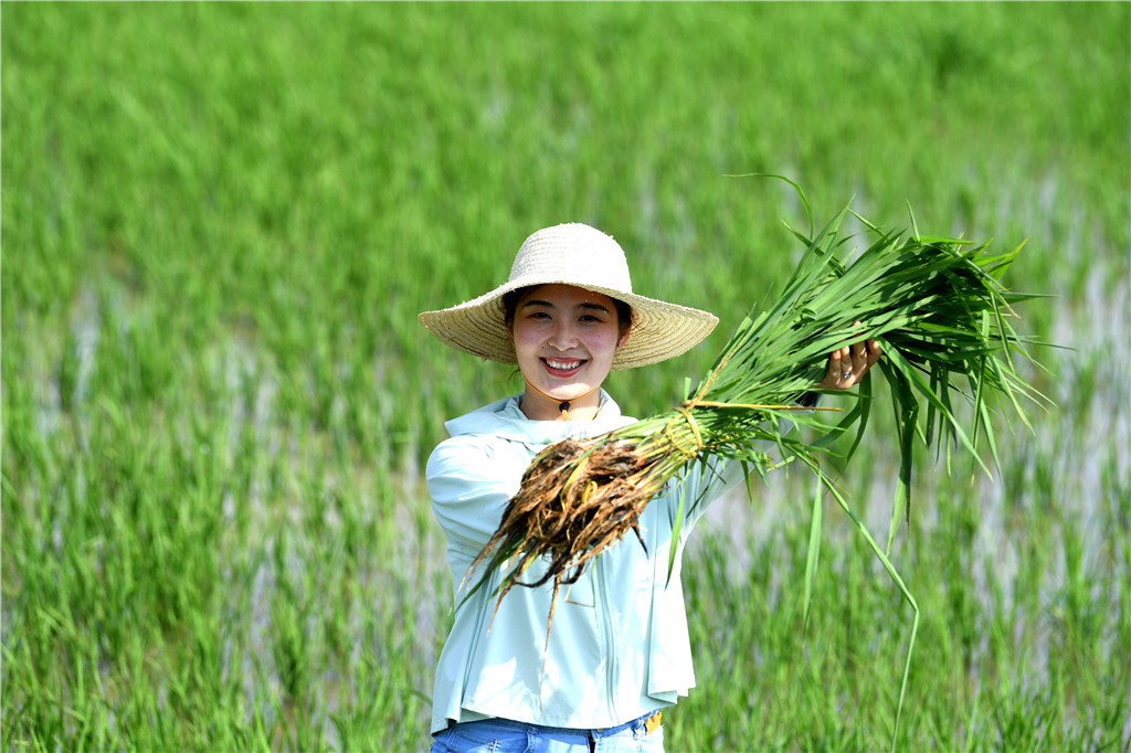 6月29日,胡盼盼在家庭农场稻田里展示用于补插的秧苗。