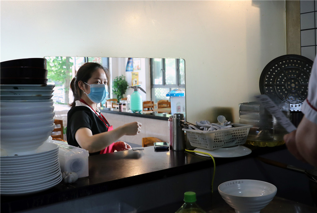 7月4日,陶虹宏将外卖订单递给后厨师傅。