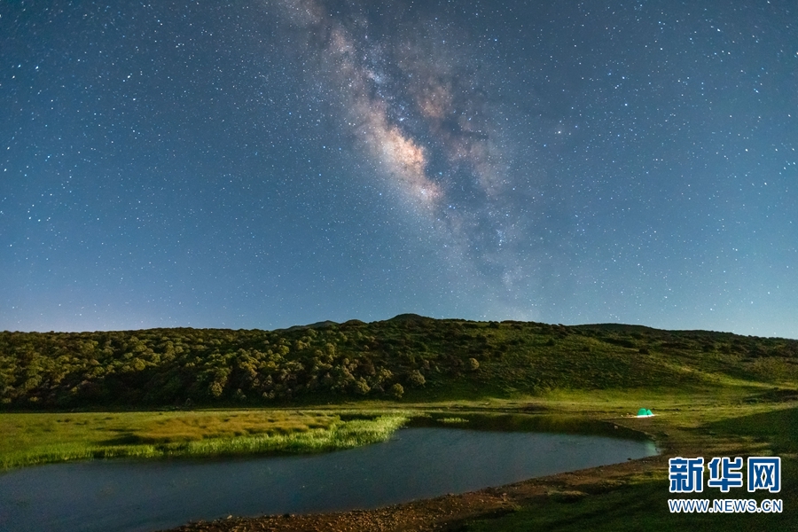 洱源县鸟吊山,点点星光倒映在山前的水潭里,“醉后不知天在水,满船清梦压星河。”(摄于7月7日)。新华网发(杨灿华/摄)