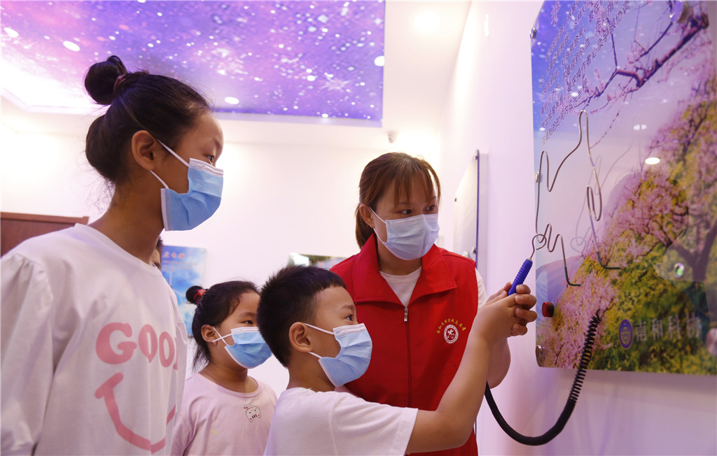 7月17日,在河北省邢台市南和区和阳镇和韵社区人文公共空间,文明实践志愿者为孩子们讲解科普知识。