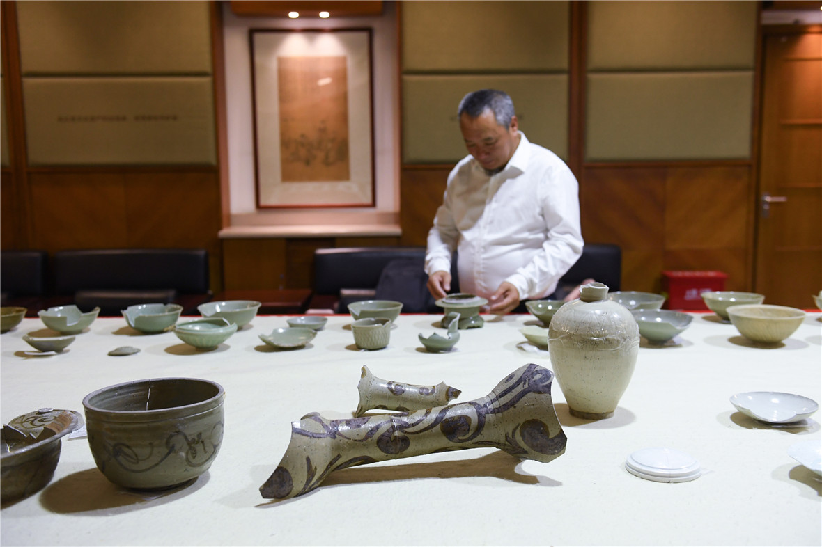 10月11日,温州市文物考古研究所工作人员在温州市博物馆库房点阅温州朔门古港遗址出土陶瓷器。