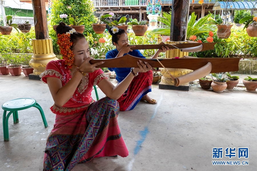 曼飞龙村民小组,两个傣族姑娘正在练习射弩(摄于9月4日)。(新华网 李浩/摄)