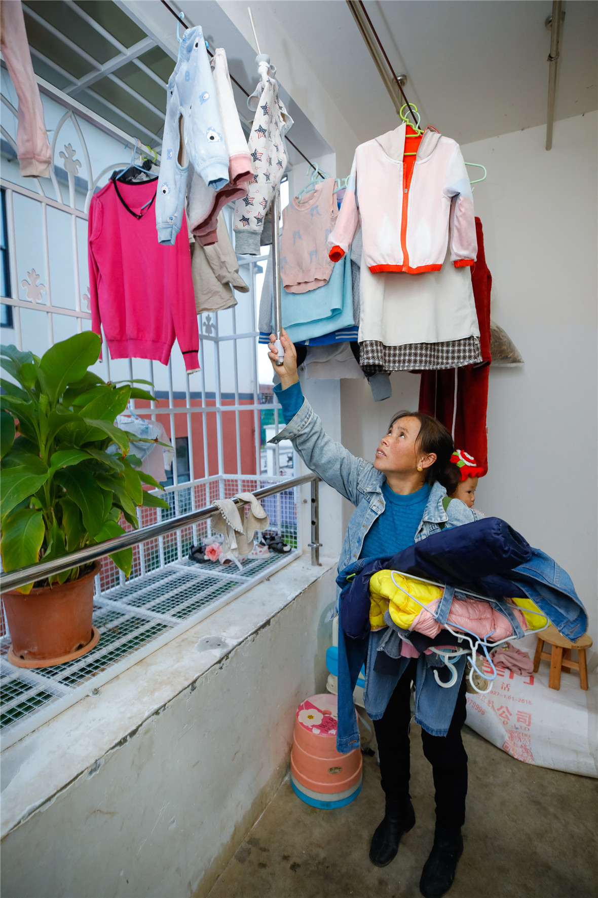10月28日,在四川省凉山州越西县越城镇城北感恩社区,易地扶贫搬迁到此的沙马石各在阳台上收洗好的衣服,搬进楼房后她也用上了洗衣机。