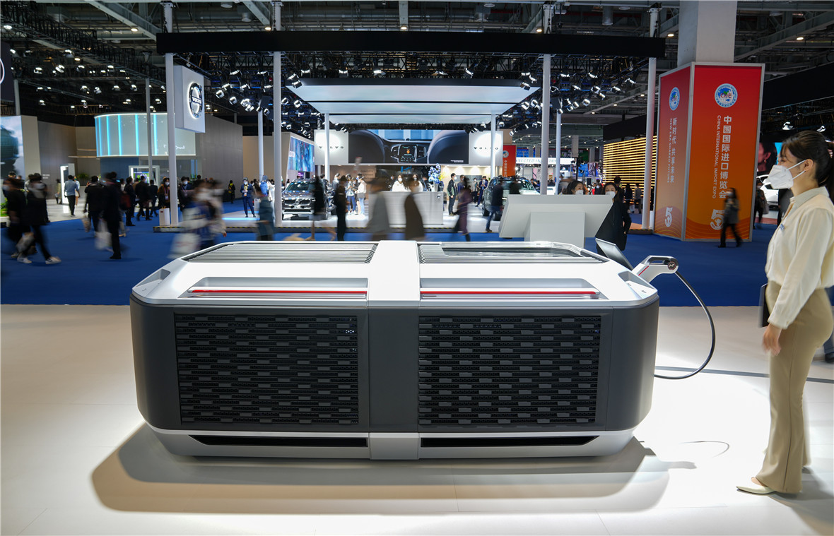 11月6日在第五届进博会汽车展区拍摄的韩国现代汽车公司氢燃料电池系统发电机。