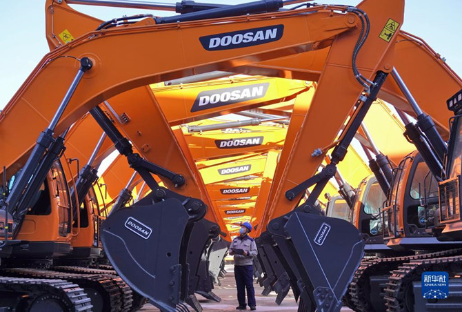 工作人员在山东烟台开发区一家工程机械有限公司检查出厂机械设备(1月17日摄)。新华社发(唐克 摄)