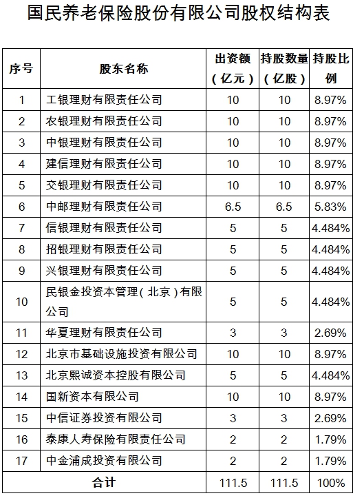 2021年9月2日,银保监会批复同意工银理财有限责任公司、农银理财有限责任公司、中银理财有限责任公司、建信理财有限责任公司、交银理财有限责任公司、中邮理财有限责任公司、信银理财有限责任公司、招银理财有限责任公司、兴银理财有限责任公司、民银金投资本管理(北京)有限公司、华夏理财有限责任公司、北京市基础设施投资有限公司、北京熙诚资本控股有限公司、国新资本有限公司、中信证券投资有限公司、泰康人寿保险有限责任公司、中金浦成投资有限公司17家公司共同发起筹建国民养老保险股份有限公司。