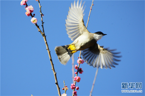近日,位于云南省曲靖市沾益区玉林广场上的梅花在冬日的暖阳下吐蕊绽放。暗香疏影、花色宜人,花间蜂蝶纷飞,小鸟枝头觅食、嬉戏,成为了冬日城市里的一道亮丽风景。新华网发(杨俊鹏摄影报道)