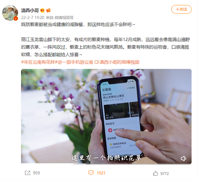 此外,拥有750万粉丝的知名自媒体博主“滇西小哥”,在2月7日首次尝试在其传统美食、美景节目拍摄制作中与“游云南”App进行互动,体验了景区预约、慢直播和识花草等实用功能。视频发布后,引发不少网友好评,并下载“游云南”App。据悉,“游云南”App是“一部手机游云南”项目面向游客群体的全域智慧旅游客户端,正式上线三年多来,已被累计下载近3000万次,为游客提供服务超两亿次。