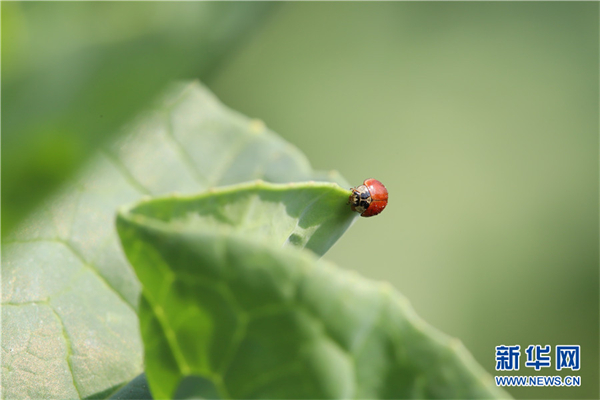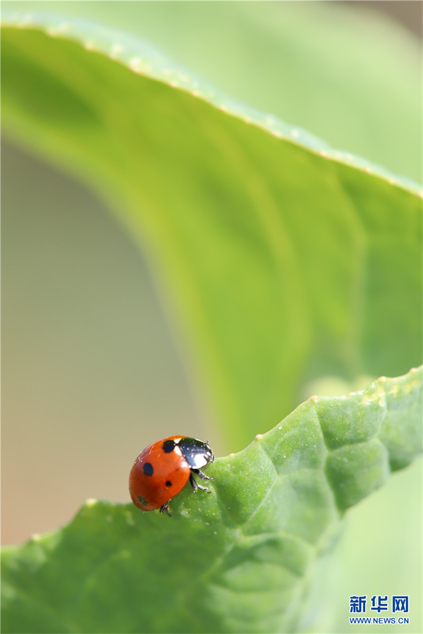 2月26日,云南省曲靖市沾益区一片菜地里,一只小瓢虫在菜叶上爬行。