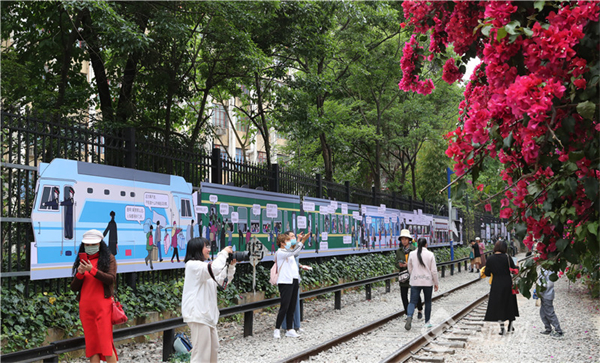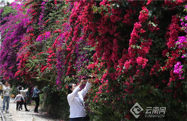 连日来,昆明地台寺云南师大校区外百年米轨铁路沿线的三角梅进入盛花期,从两侧围墙上垂下的花枝上开满了丛丛簇簇大红大紫的花朵,远远看去似绚烂的花瀑流淌而下;沿着百年米轨一路行走一路赏花,三角梅花瀑点燃红火的五月,呈现绚烂美丽的花景,吸引众多市民和游人慕名前来打卡拍照。游人不仅可沿米轨线路观赏美丽的三角梅花景,还可以通过铁路沿线新建的文化走廊和文创展示了解百年米轨的历史文化和昆明铁路建设发展情况。