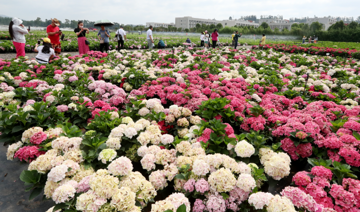 端午假日,在昆明宜良福建新保绣球园种植基地,游人在种植基地花圃打卡拍照、选购心仪的花木,在灿烂花海中度过充满缤纷色彩的休闲假日。