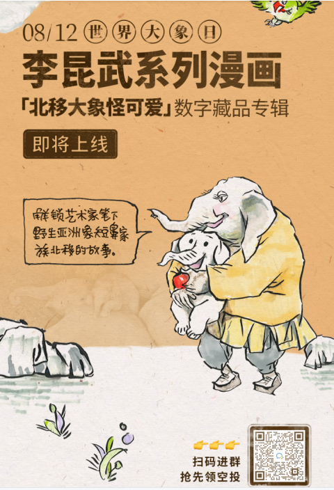 李昆武工作室在世界大象日为大家带来的一系列艺术作品,就是希望通过数字藏品这一潮流的科创产品形式以及有趣生动地表现形式,唤起社会大众对于亚洲象保护更多的关注。除了数字藏品外,李昆武老师还将以保护亚洲象为主题创作一系列的跨界艺术作品,希望将亚洲象的故事与青年亚文化开展更多的跨文化交流与创作,带领更多的年轻人参与到亚洲象保护的工作进程中来。