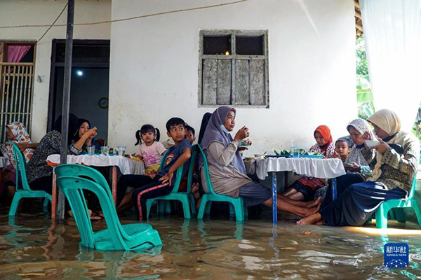3月16日,在印度尼西亚中爪哇省芝拉扎的一座村庄,人们在被洪水浸泡的婚礼现场用餐。 新华社发(阿南格·菲尔曼夏 摄)