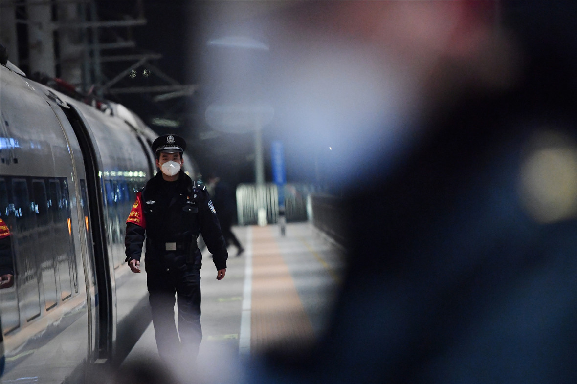 1月9日,在兰州西站,白旭伟在他值乘的G2686次动车组列车旁巡查。