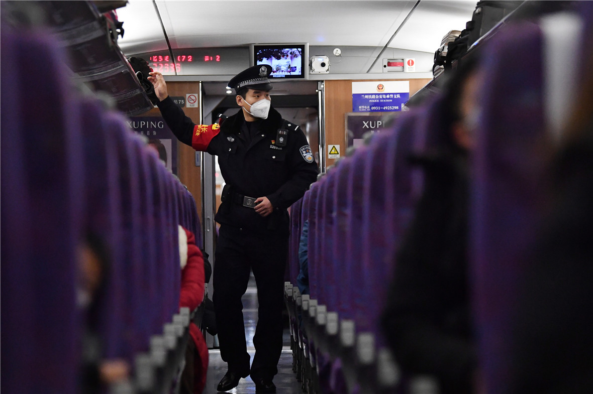 1月9日,白旭伟在G2686次动车组列车车厢内巡查。