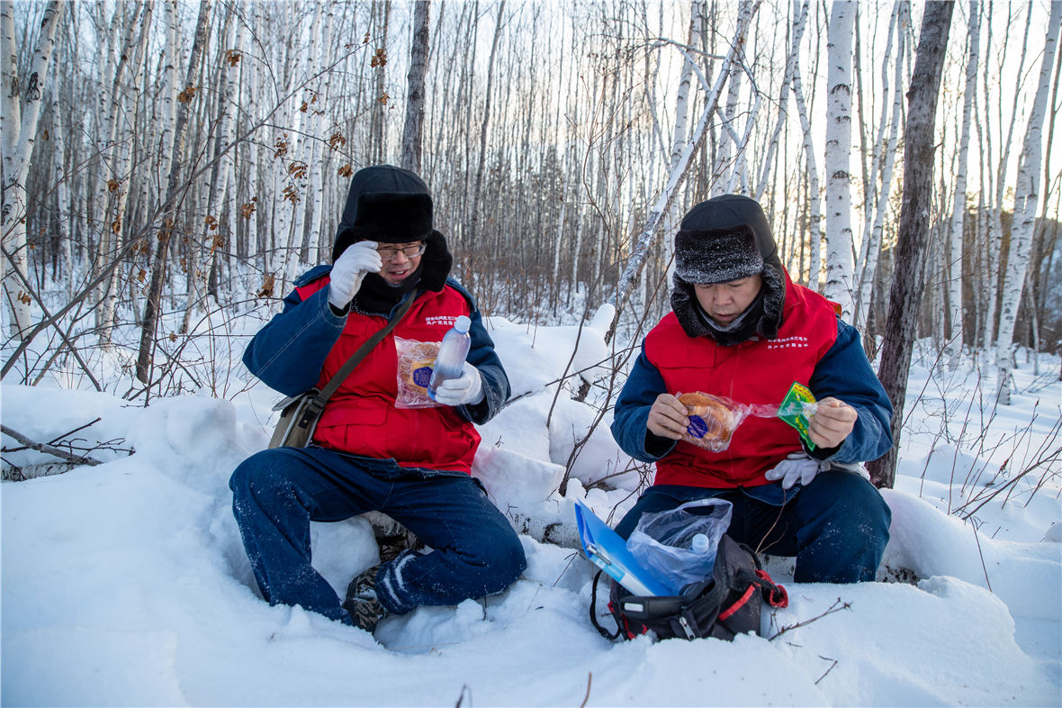 1月9日,线路设备运维人员马国军(右)和代洪滨在巡查间隙吃饭休息。新华社记者 张涛 摄