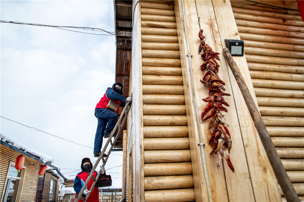 1月9日,在漠河市北极村,线路设备运维人员代洪滨(右)和马国军在检查设备。新华社记者 张涛 摄