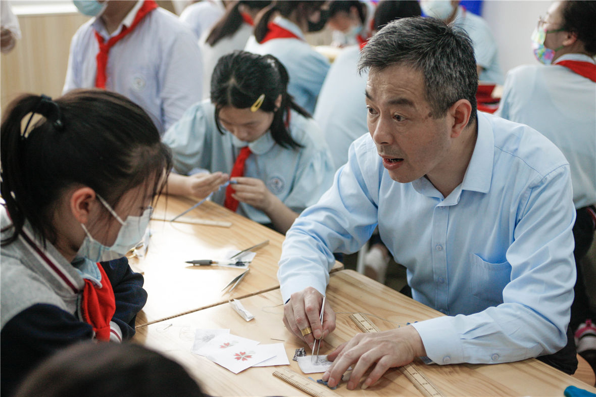 5月30日,江满宗(右)在上海市青云中学教学生做盘扣。