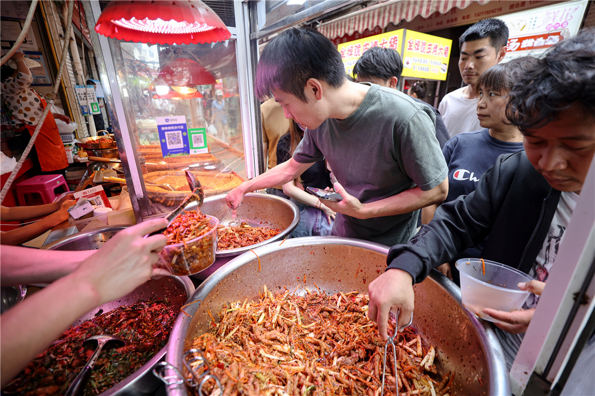 奶白酒、木姜子鸡爪、豆花米线、木瓜水、烧饵块、烤乳扇……在昆明大观篆新农贸市场内,各类特色小吃摊位前聚满了购买美食的市民游客。云南暑期旅游热,“农贸市场游”成潮流,其中玩转大观篆新农贸市场,成为各大社交平台上云南旅游推荐笔记里的必打卡事项。