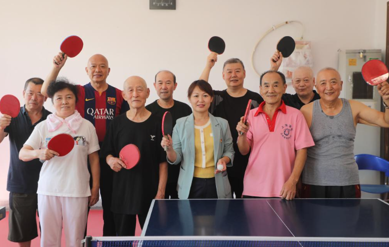 2022年7月21日,抚顺社区党委书记郝丽影(前排左三)与辖区内老人在乒乓球比赛后合影。(受访者供图)