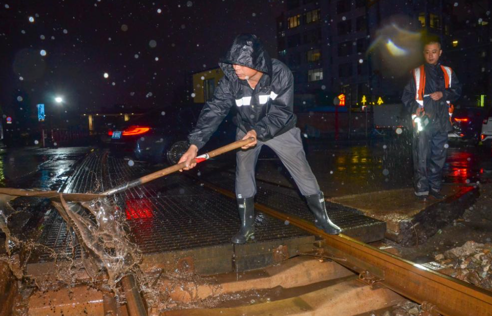 沈铁丹东工务段职工正在疏通道口排水设施。(迟金海 摄)