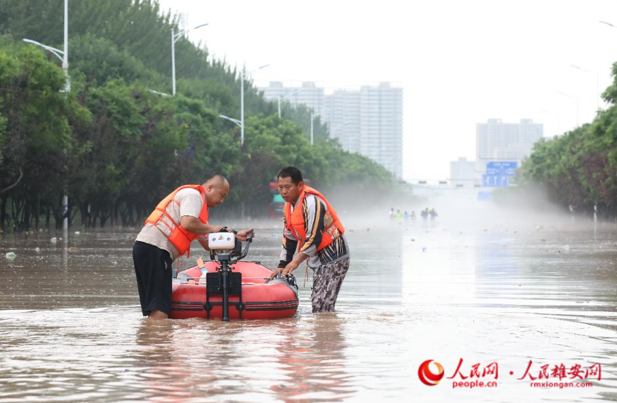 涿州市腾飞大街,救援人员正在准备冲锋舟。 人民网 李兆民摄