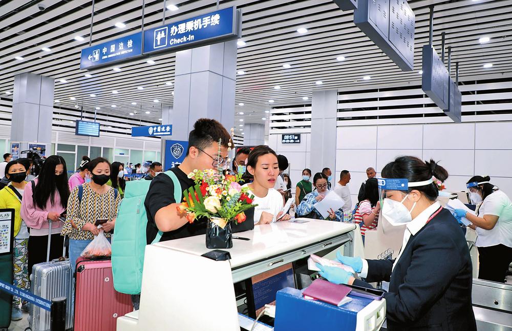 3月28日上午,122名旅客乘坐苏南瑞丽航空公司的航班由西双版纳飞往泰国清迈,这条停飞3年的国际航线恢复通航,每周二、四、六各有一个航班由西双版纳飞往泰国清迈。云南日报记者 戴振华 摄