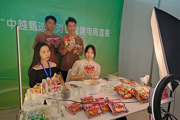“这是越南的方便面,我们有不同口味供大家选择哦,喜欢酸辣味的可以拍这款。”在中国—东盟(河口)跨境电商物流产业园的展区,参加“中越甄选”河口跨境电商直播大赛的中国主播正在直播介绍越南方便面。