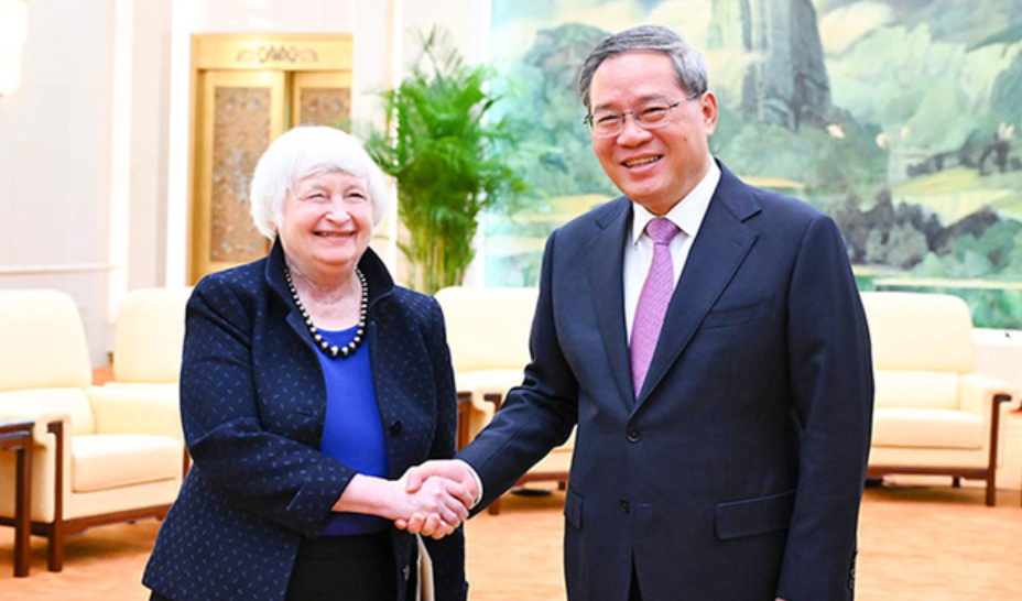 中国国务院总理李强4月7日上午在北京人民大会堂会见美国财政部长耶伦。