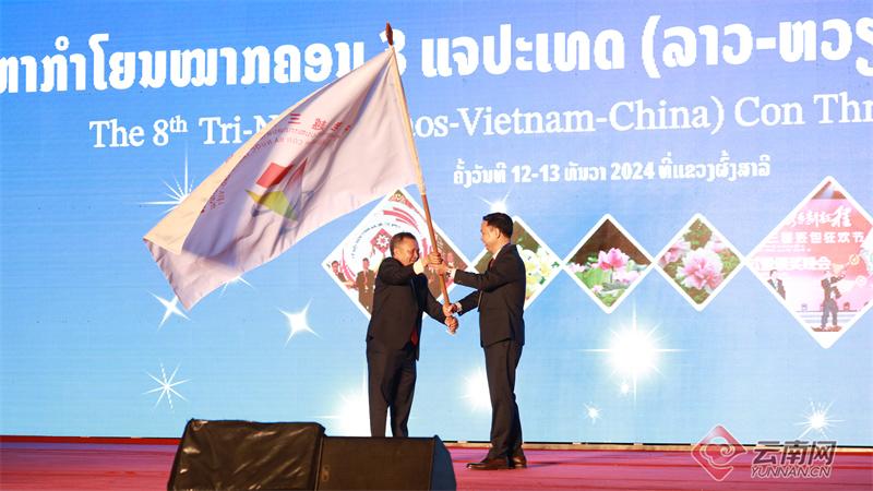 闭幕式揭晓了本届节会设置的比赛项目获奖名单。根据中老越三国丢包狂欢节由中老越三方轮流举办的约定,老挝方将节旗移交至越南勐念县代表手中,活动最后在三国文艺汇演中圆满落幕。2025年第九届中老越三国丢包狂欢节将在越南奠边省勐念县举办。