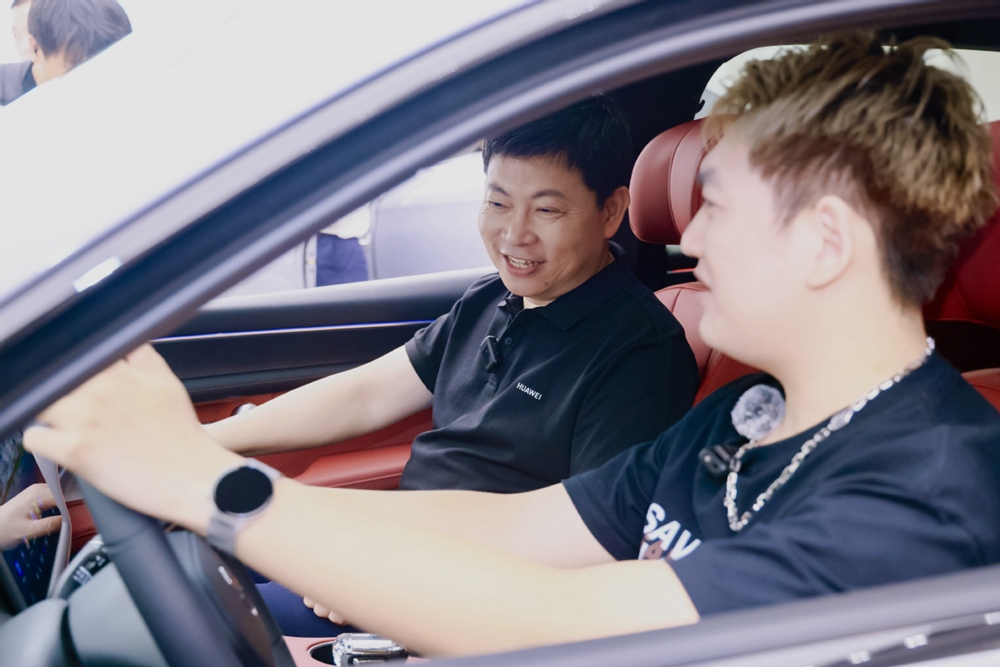 Yu Chengdong (left), chairman of Huawei's consumer business group, talks with the owner of a Huawei Aito M5 car on Wednesday in Shenzhen, Guangdong province. [China Daily/Photo]