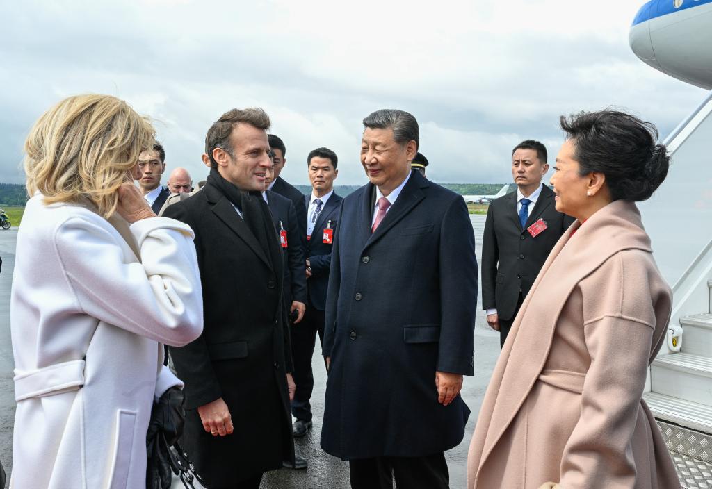 ปธน.มาครง และนาง Brigitte Macron ภรรยาเดินทางถึงล่วงหน้า นำคณะผู้แทนทางการท้องถิ่น ไปต้อนรับถึงท่าอากาศยาน Tarbes รัฐ Hautes-Pyrenees ยินดีต้องรับนายสี จิ้นผิงกับภรรยามาเยือน รัฐ Hautes-Pyrenees ที่มีความหมายพิเศษกับปธน.มาครง