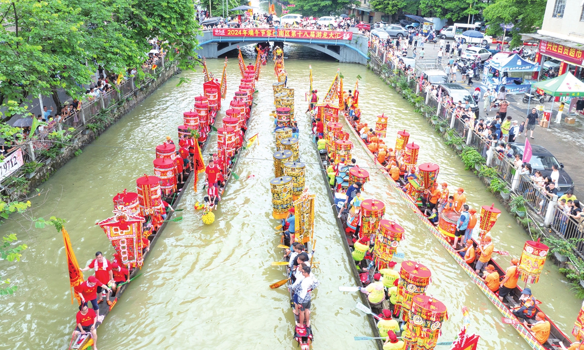 The southern district of Ronggui is festively decorated for the Dragon Boat Festival, hosting a grand dragon boat parade in Shunde district, Foshan, South China's Guangdong Province on June 10, 2024.