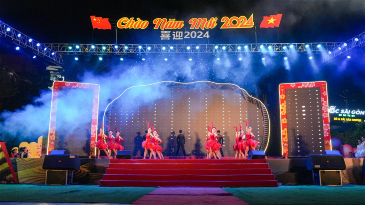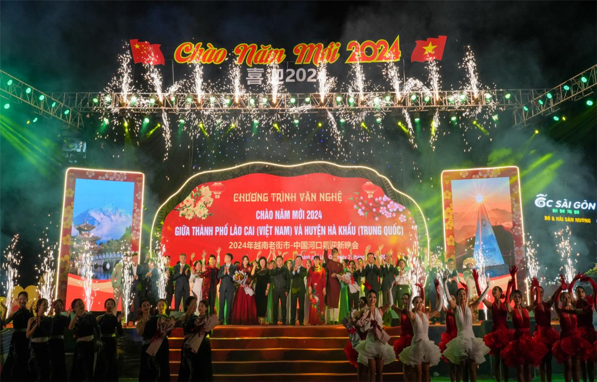 2023年12月31日晚,中国河口县与越南老街市迎新联欢晚会在越南老街举行,中越两国演员与现场观众在歌舞中共迎新年。