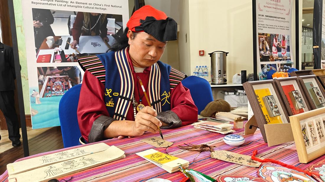 A Yunnan cultural inheritor creates Dongba paintings at the reception.