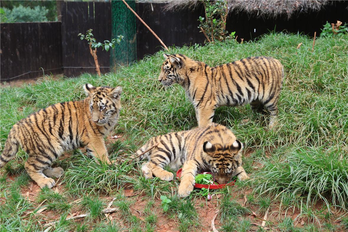 Tiger calves enjoy food at the Yunnan Wildlife Park in Kunming.