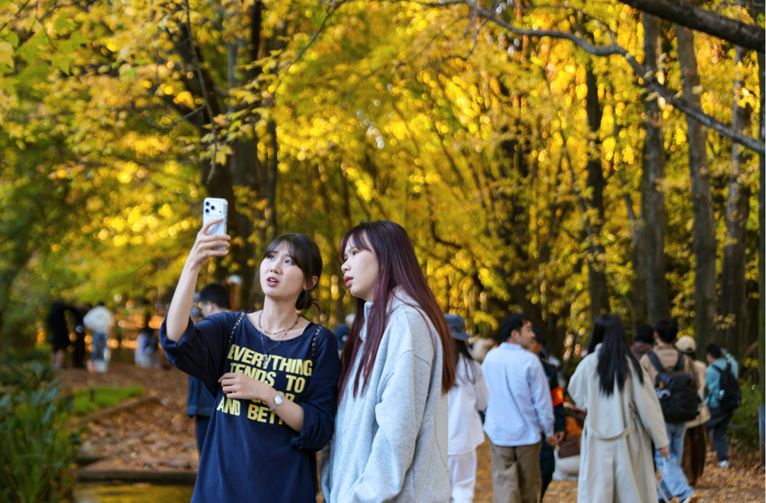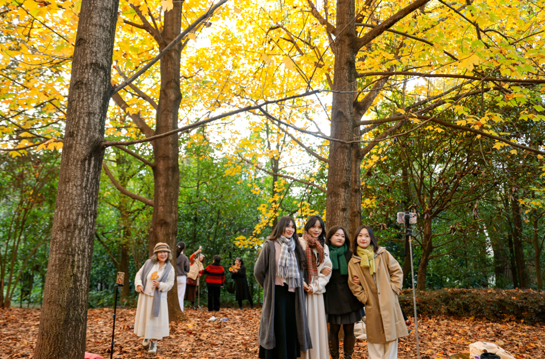 Tourists have a group photo against the maple trees at Kunming Botanical Garden.