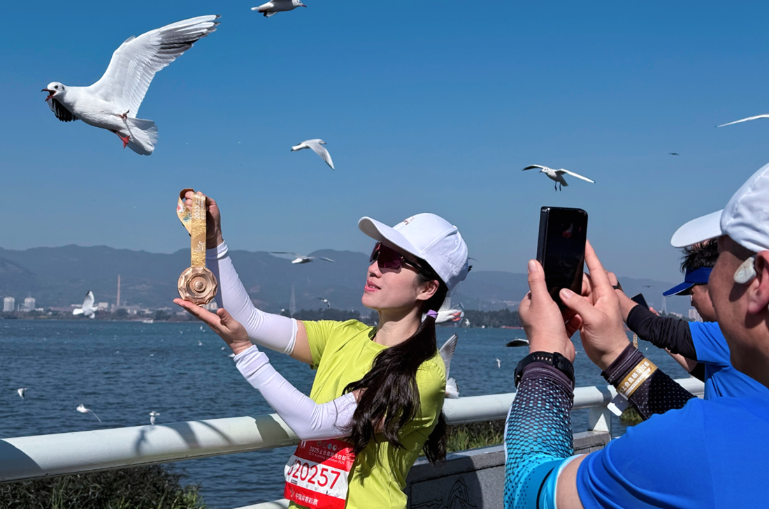 A runner poses for a photo at the Dianchi Lake near the event venue after race.