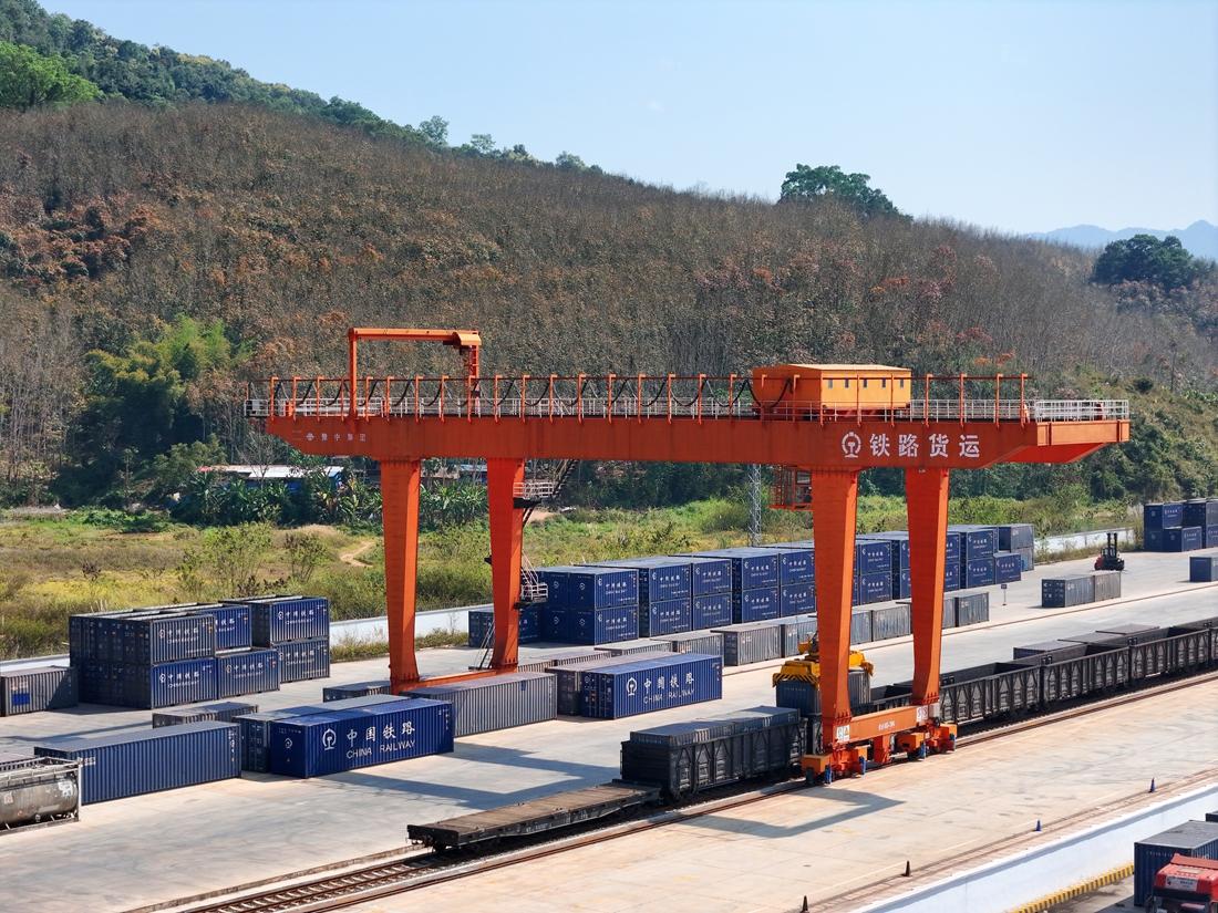 A gantry crane has loading and unloading operations in the freight yard of Mohan station on the China-Laos Railway.