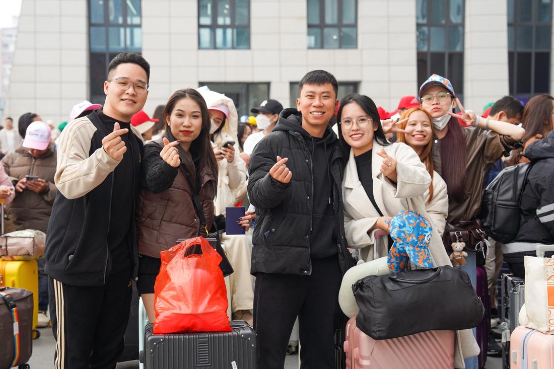 Vietnamese tourists pose for a photo at the Hekou border gate.