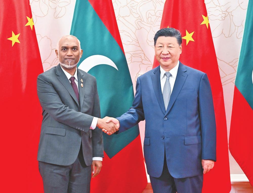 8月31日上午,国家主席习近平在天津迎宾馆会见来华出席2025年上海合作组织峰会和纪念中国人民抗日战争暨世界反法西斯战争胜利80周年活动的马尔代夫总统穆伊兹。