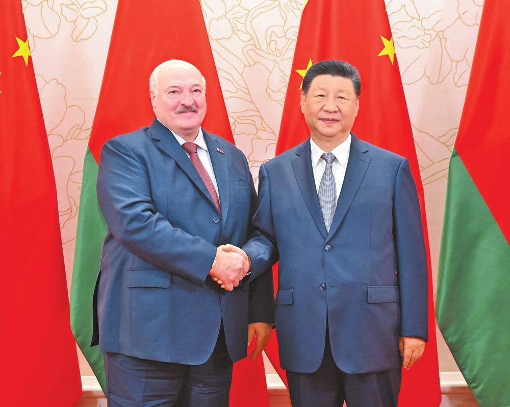 习近平指出,中国和白俄罗斯人民曾并肩战斗,共同为粉碎军国主义和法西斯主义作出重大贡献,结下深厚友谊。当前,世界百年变局加速演进,人类又一次站在十字路口。中方愿同白方担当时代责任,践行真正的多边主义,共同促进世界和平、发展、合作、共赢。