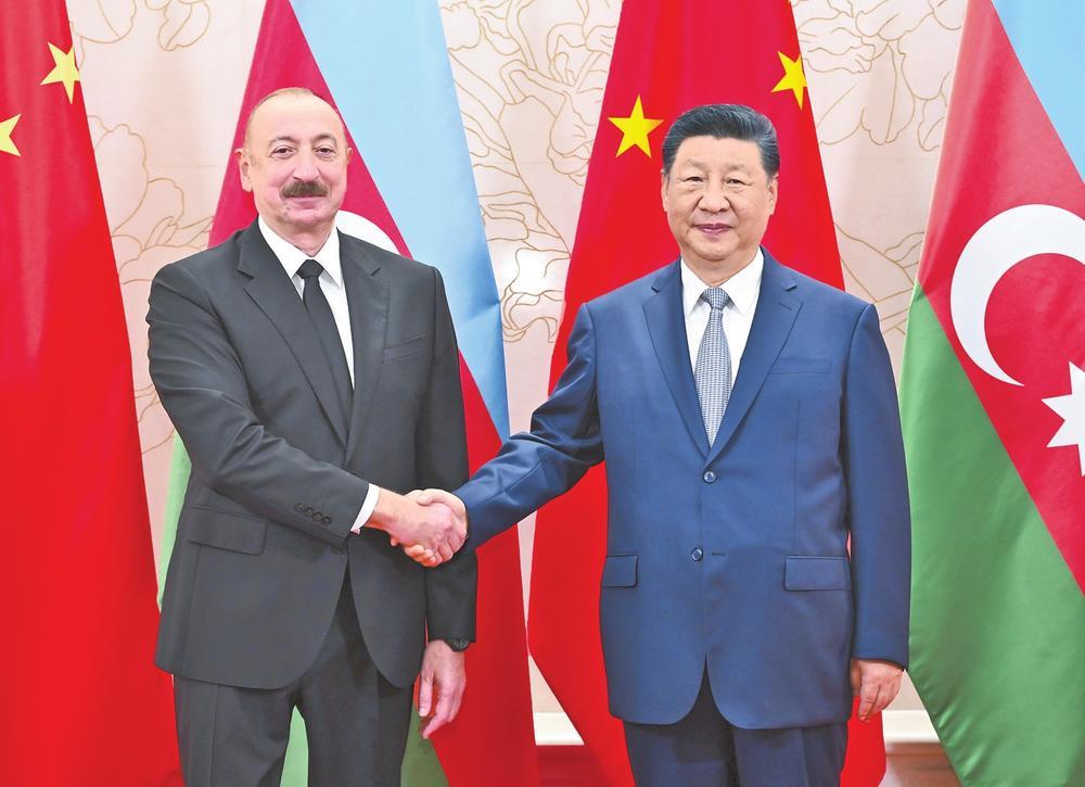 习近平指出,中国同阿塞拜疆是好朋友、好伙伴。建交33年来,两国传统友谊日益深化,政治互信持续巩固,互利合作成果丰硕。今年4月,我们宣布中阿建立全面战略伙伴关系,开启两国全方位合作新篇章。中阿两国是发展振兴的同路人,中方愿同阿方一道,保持双边合作蓬勃发展势头,共创两国共赢发展新未来。