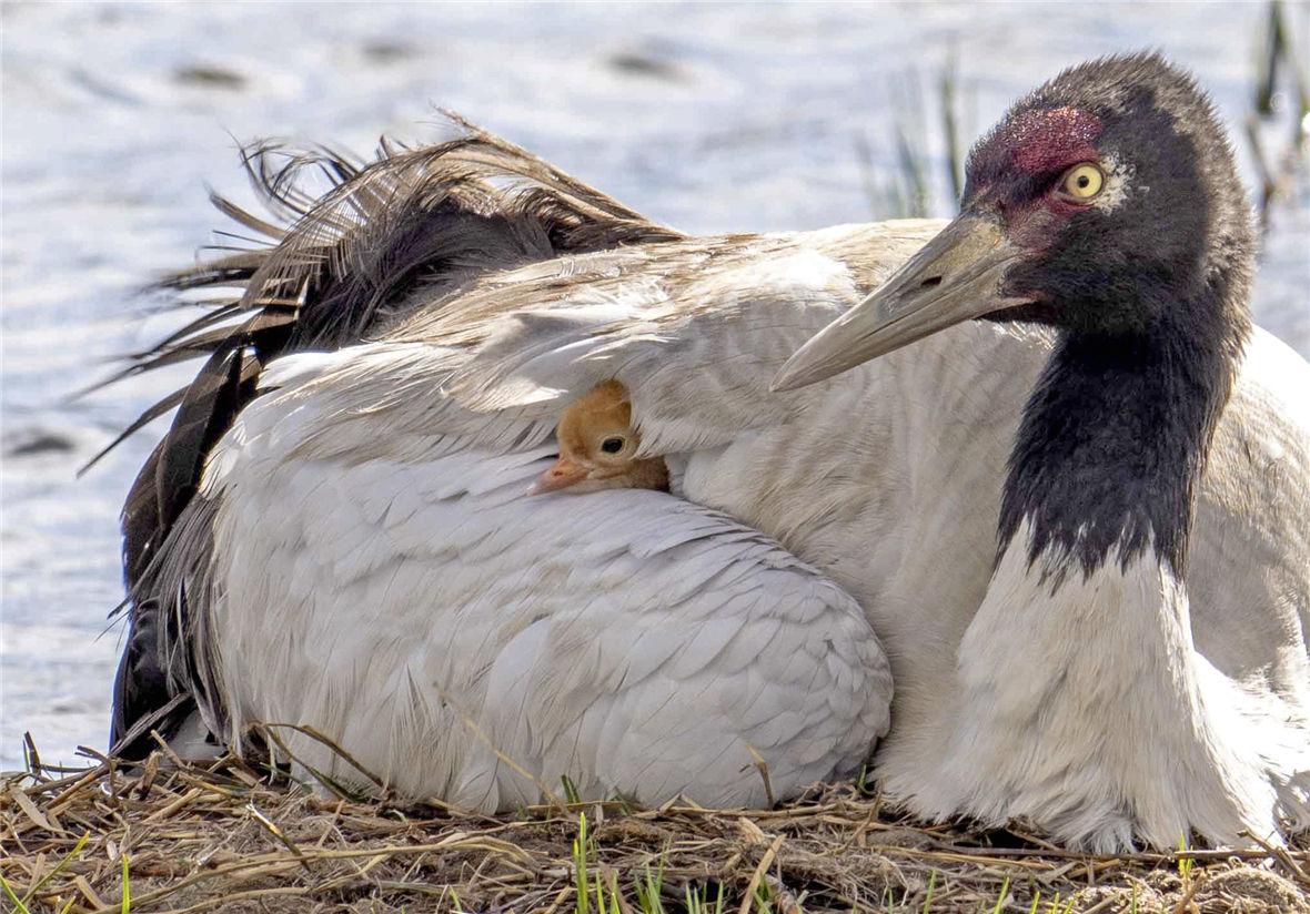 每年6月,一对对黑颈鹤在西藏自治区那曲市申扎县海拔约4700米的湿地里孕育下一代。破壳不久的小黑颈鹤,披着金黄色的绒毛,紧紧跟在父母身边,学着觅食……