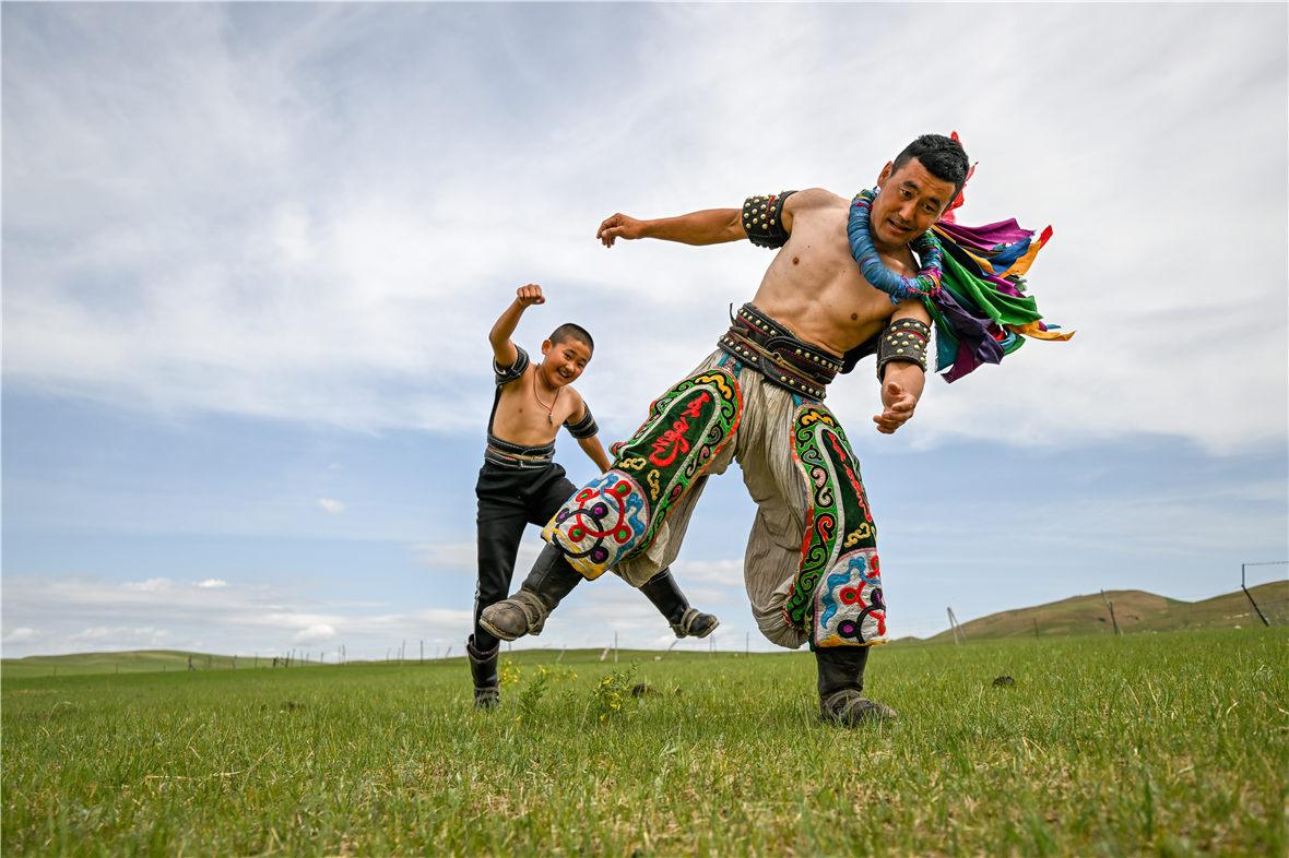 蓝天白云,绿草如茵。夏日的锡林郭勒大草原风景如画,37岁的牧民敖日布桑和他12岁的儿子德格金在这片理想的搏克场地上摩拳擦掌,准备相互角力。