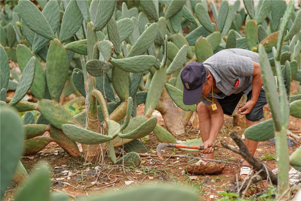 烈日下的云南省文山市新平街道红旗社区庄子田居民小组,数千亩仙人掌从石缝中倔强钻出,连缀成片,绿意盎然。