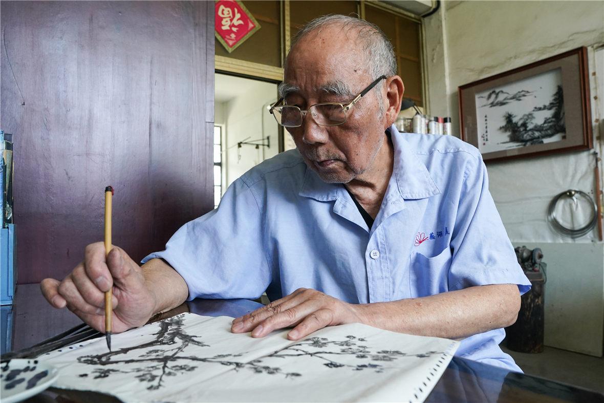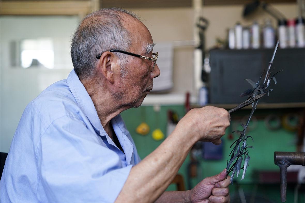 今年80岁的汤传松,是芜湖铁画锻制技艺省级非物质文化遗产传承人。据汤传松介绍,铁画锻制工艺起源于铁匠,需将铁烧红,然后使用锤头趁热打铁,将铁塑造成画稿中的基本形状,而后使用锉、钻等工具进一步塑造,再用剪刀、镊子进行修形,再将各个部位焊接组合,最后装裱成画。