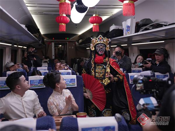 据了解,此次活动持续4个多小时,涵盖中老两国特色歌舞、近景魔术、乐器演奏、中老美食分享等50多个节目,车厢里掌声和笑声不断。活动中,铁路职工、导游、菜农、工程师等纷纷走上舞台,向旅客们分享了中老铁路通车以来的变化。