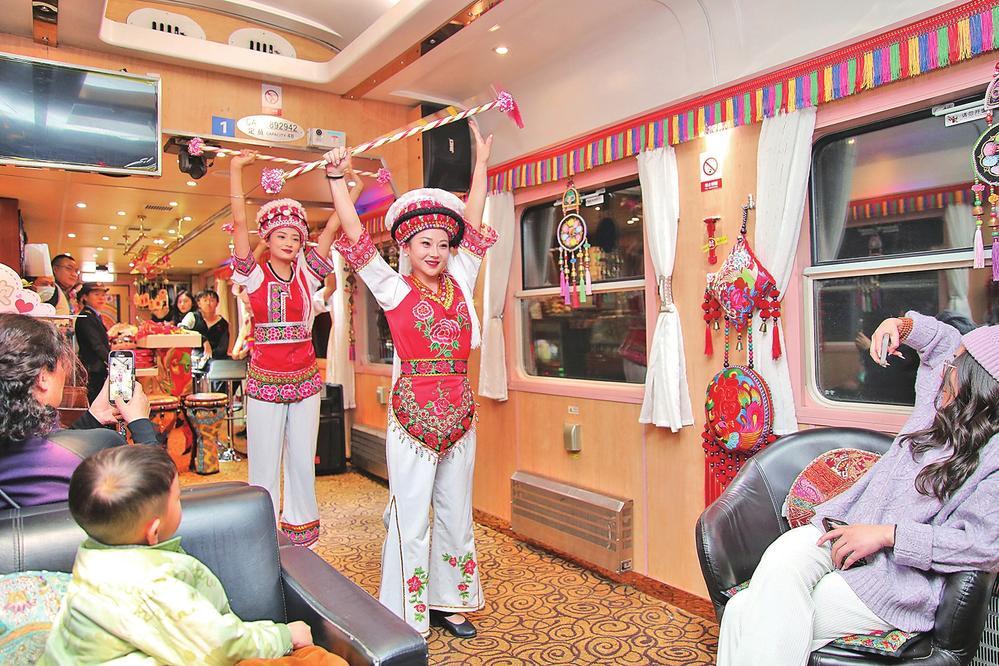 丽江至大理的Y762次民族团结进步示范列车上,乘务员表演白族《霸王鞭》。 国铁昆明局供图